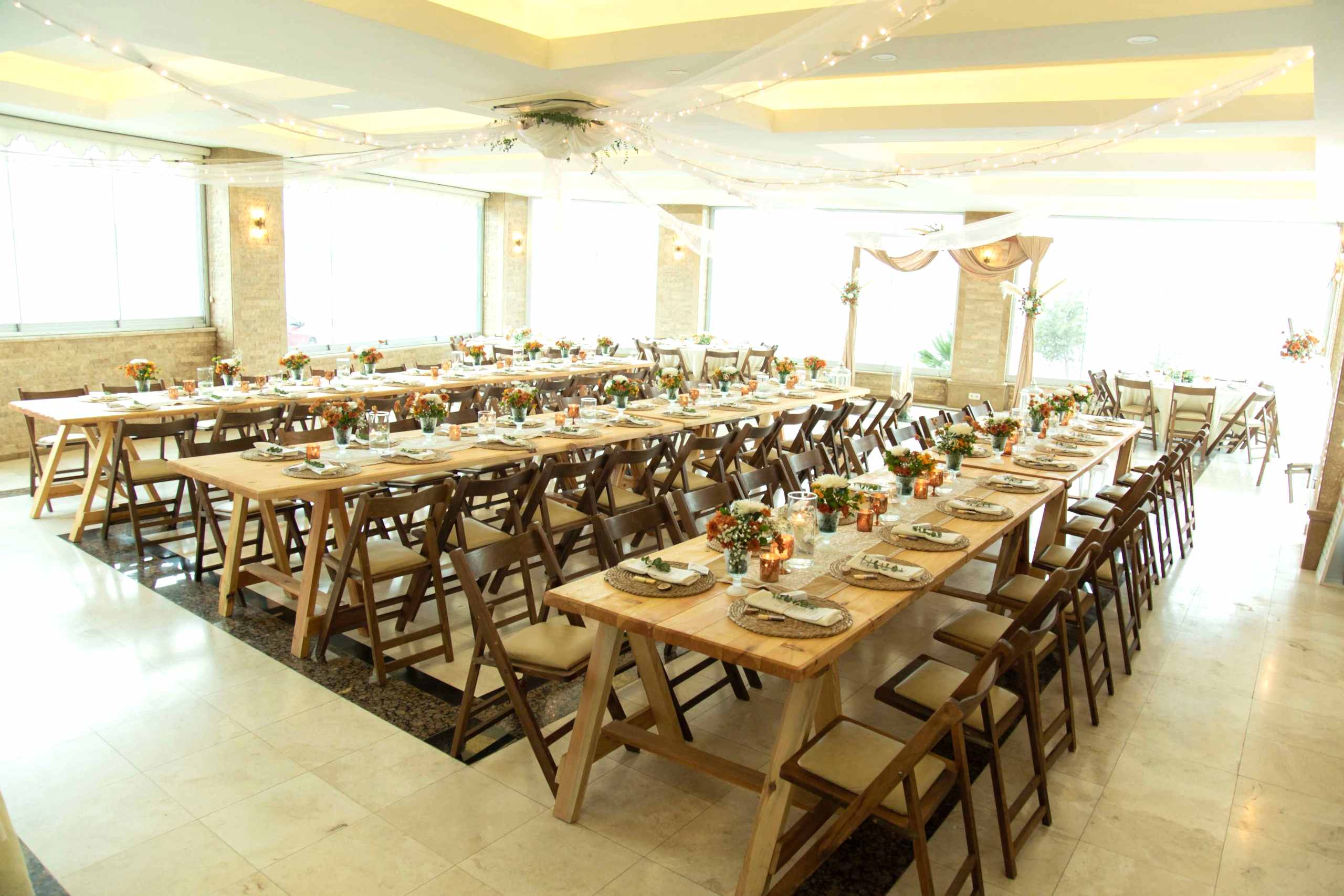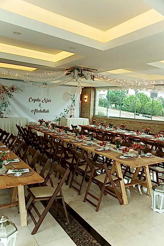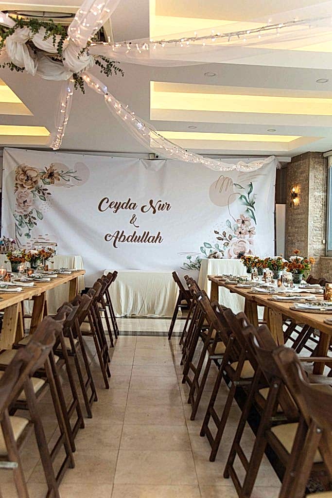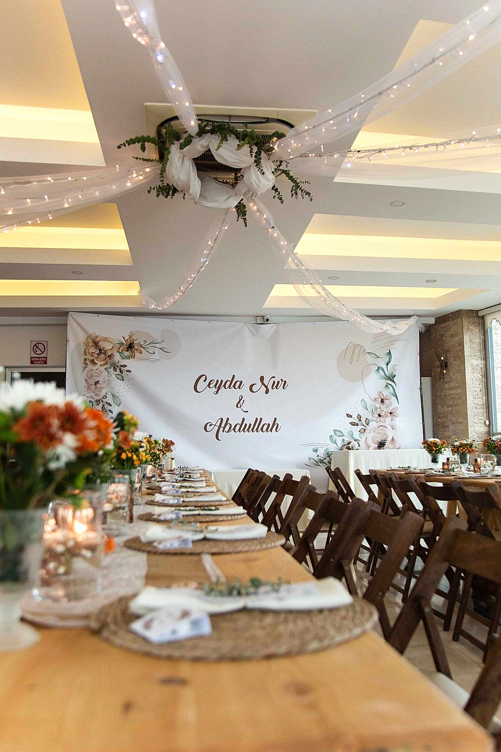 Sevgili çiftimiz Ceyda ve Abdullah ile Kıvrak Otel’de gerçekleştirdiğimiz nişan organizasyonunda ahşap masalarımız ve sandalyelerimizi kullandık. Çiftimiz ile planladığımız nişan konseptinde Tag üzerine vizon renkte kumaş örtü, panpaslar, turuncu ile yeşil çiçekler kullandık.