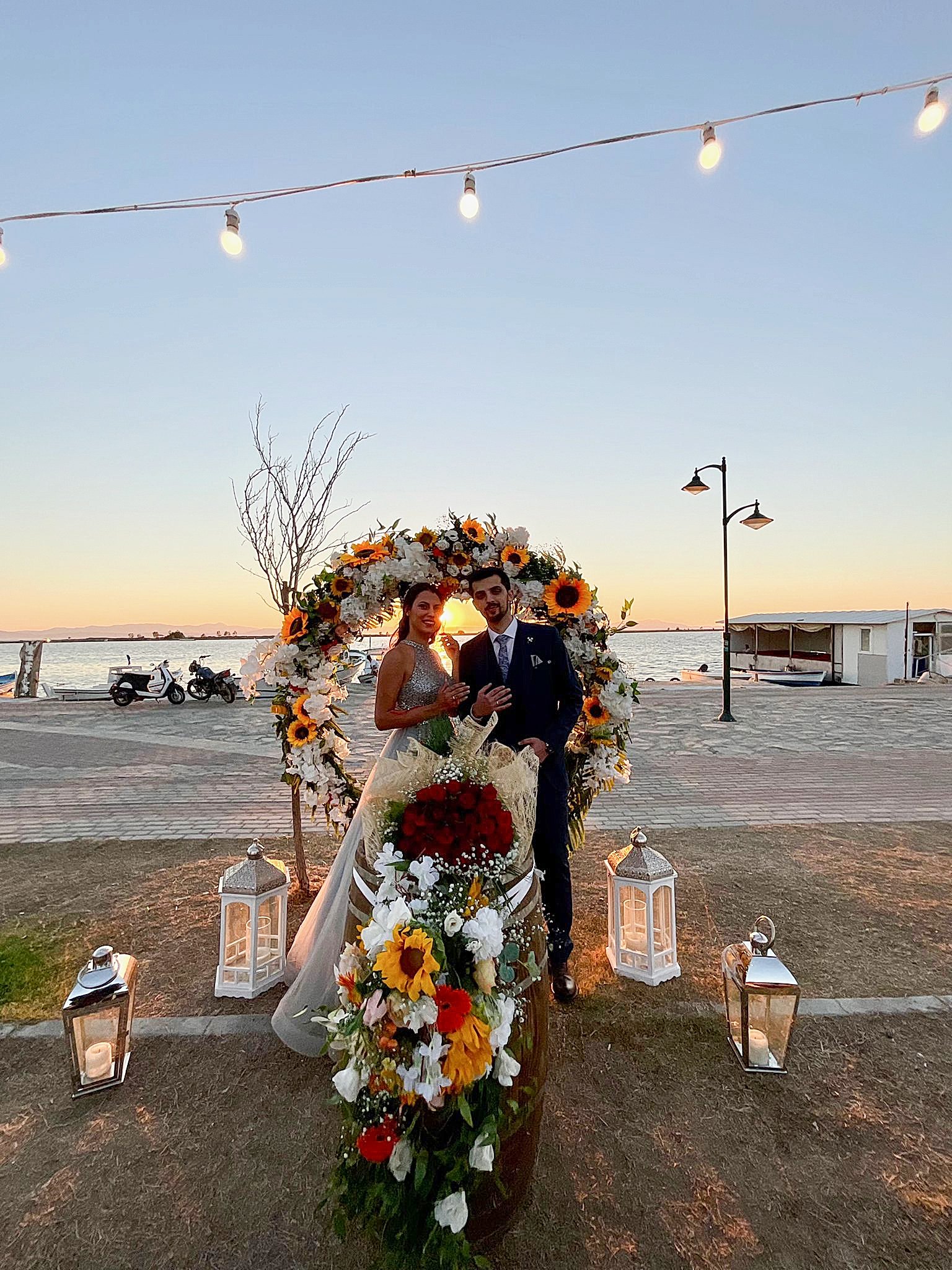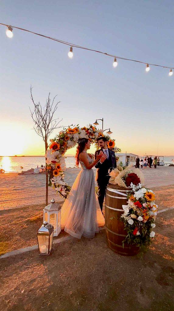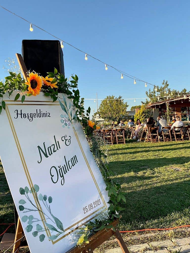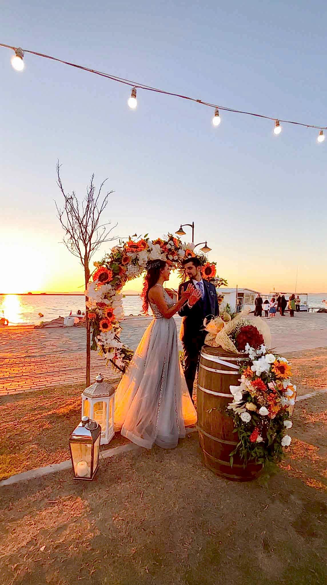 Ayçiçeklerimizin yoğun kullanıldığı, uzun ahşap masalarımıza sarmaşık yapraklarıyla cipsonun kullanıldığı güzel bir konsept oluşturduk. Güneşin batışıyla daha da romantikleşen, gün batımının turunculuğunu ölümsüzleştiren Nazlı ve Oğulcan çiftimizin Tag’in önünde çekildiği fotoğrafı sizlerle paylaşmak isteriz.