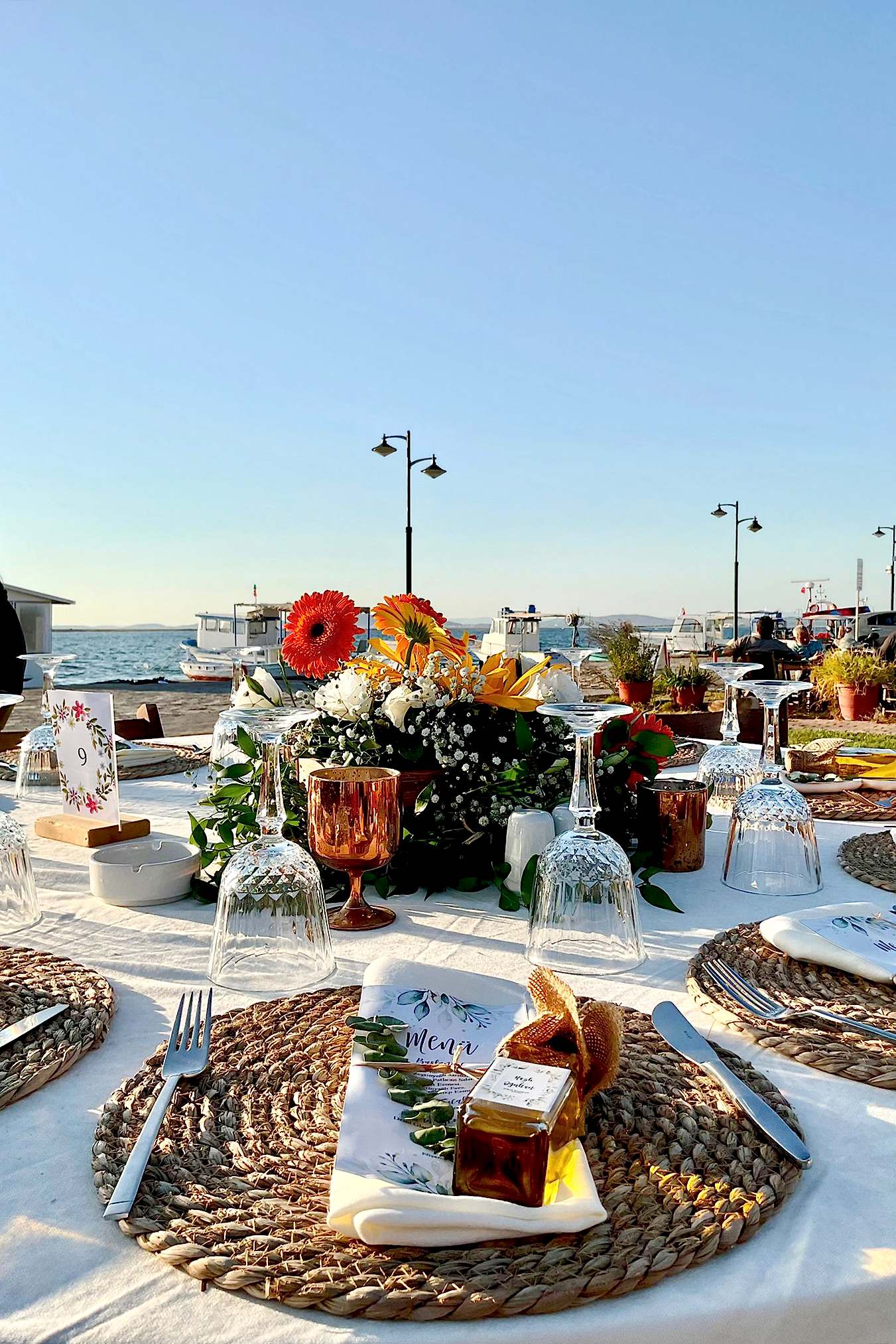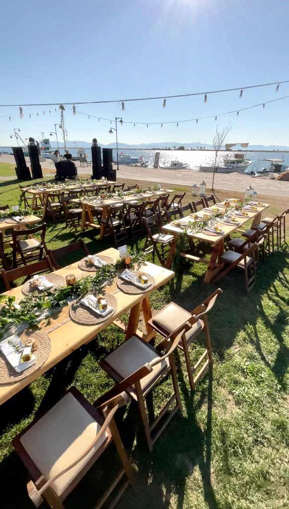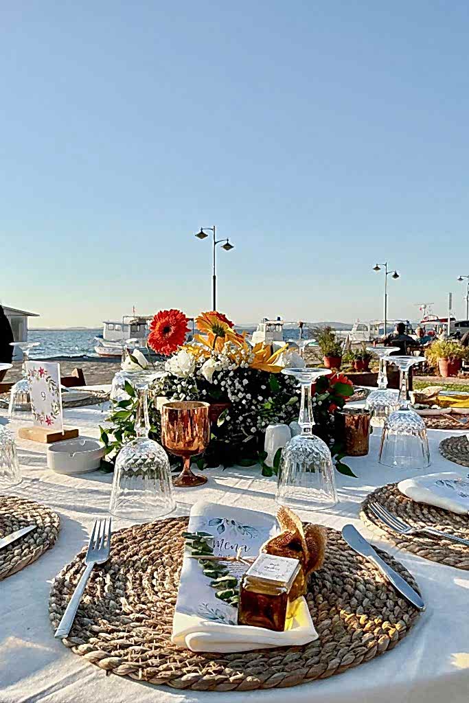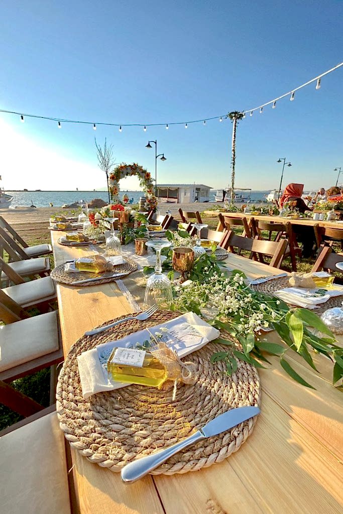 Denizin kıyısındaki mekana ahşap masalarımız ve yuvarlak masalarımızı kullanarak bir konsept oluşturduk. Hasır suplalarımızın ve turuncu ağırlıklı canlı çiçeklerimizin yoğunlukta olduğu nişan organizasyonumuza gelin hep birlikte bakalım.